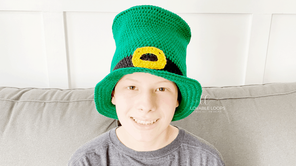 This Leprechaun Top Hat crochet pattern is much easier to crochet than it looks. It’s worked in the round from the top down using half double crochet stitches. I love how quickly a crochet piece works up when using half double crochet (hdc). If you don’t celebrate St. Patrick’s Day, you could change the colors and turn this pattern into a snowman top hat.