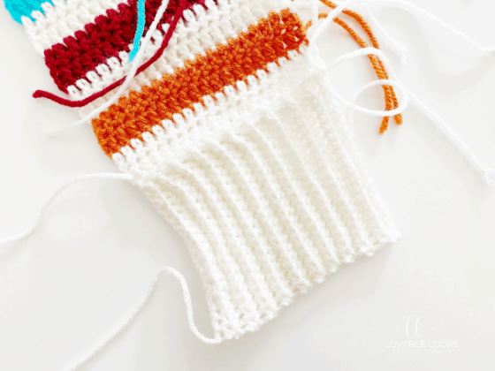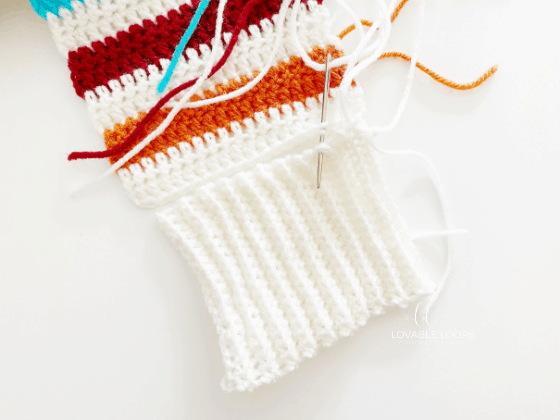 Line up the other ribbing you made. Sew each stitch from the scarf to one row from the ribbing.
