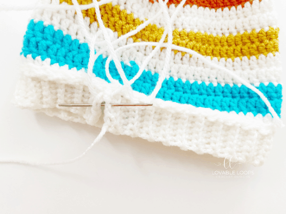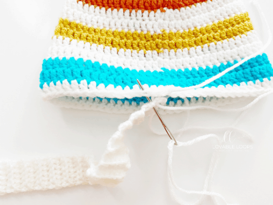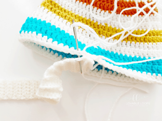 Use your tapestry needle to sew the brim to the hat. Make sure each stitch of the hat lines up with a row from the brim (60 sts/rows for child size and 64 sts/rows for adult size). The brim will stretch as you go. Sew the seam where the two ends of the brim meet.