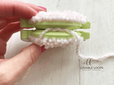 Firmly and evenly wind your white yarn around each set of arches. After the first set of arches, close them and then wind your yarn around the second set.