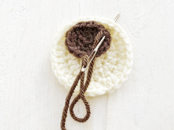 Use a tapestry needle and white yarn to add the “eye sparkle” to the corners of the eyes. I simply threaded the yarn back and forth 2-3 times.