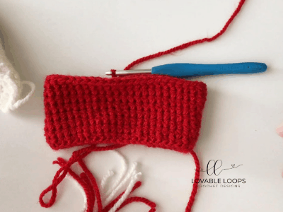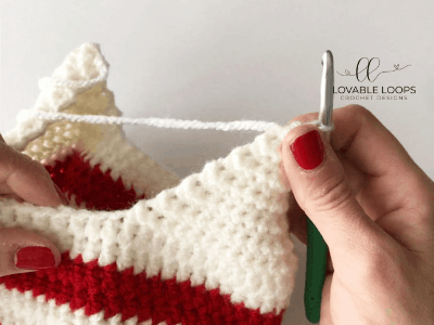 Begin with white yarn and alternate with red every two rows.
