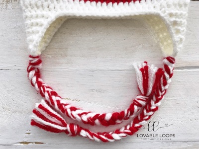 Cut six 30” strands of the red and white yarns (total= 12 strands). Holding all of the strands, fold in half and pass the folded loop through the bottom of the ear flap (use hook to help). Pass the strand ends through the loop and pull tight to form a knot. Divide the strands into three sections (8 strands in each) and braid. Repeat for 2nd braid.