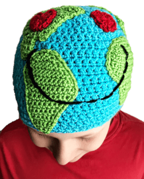Row 23: sc in 2 sts, ch 1, hdc in 2 sts and continue to sc around entire continent. Fasten off and leave a long tail to sew onto hat.