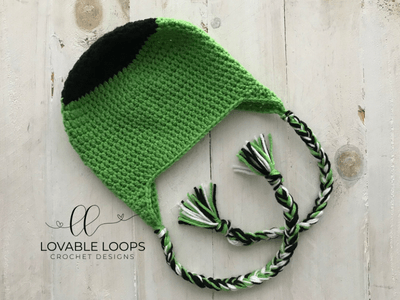 Row 13: sc2tog and if this is the first ear-flap, finish off. If this is the second ear-flap, continue to sc around entire hat and ear-flaps with green yarn.