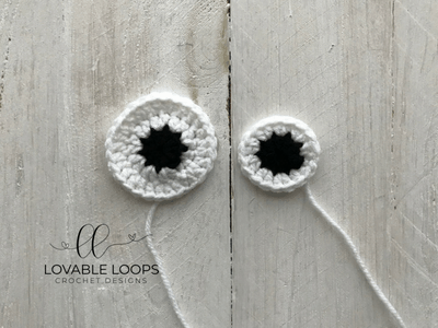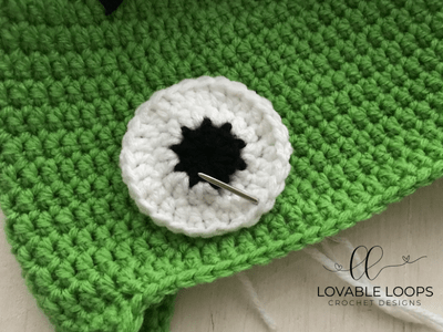Sew eyes onto bottom of hat. Make sure they are centered between the ear flaps. Since they are different sizes, line up the bottoms of the eyes.