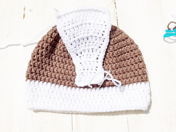 Sew the face stripe onto the hat. Make sure it is centered. The sc border should slightly overlap that first round of white you made when you were crocheting the hat. See pictures for reference.