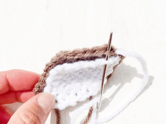 Sew the inner ear onto the outer ear using brown yarn (so you don’t see it from the back) through the front loops of the sc border of the outer ear.