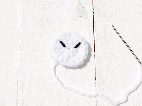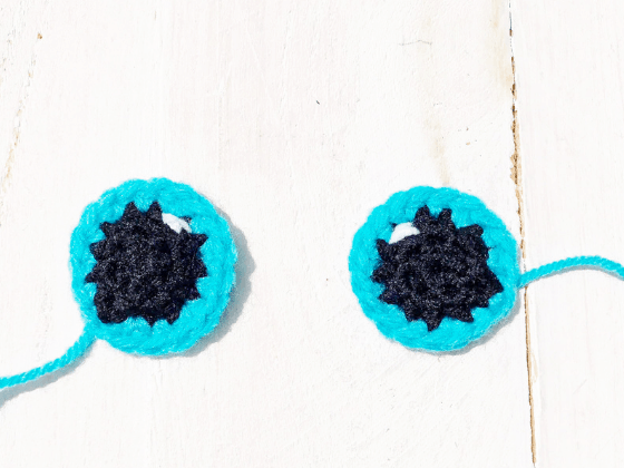 Use a tapestry needle and white yarn to add the “eye sparkle” to the corners of the eyes. I simply threaded the yarn back and forth 2-3 times.