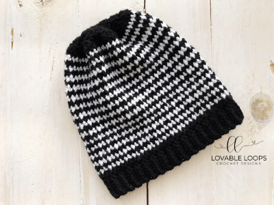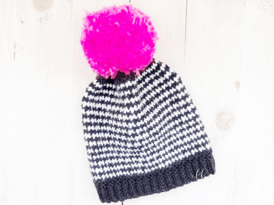 I thought it would be fun to design a slouchier style hat in a classic pattern. I love the look of Houndstooth and thought the black and white colors would look awesome for a New Years Eve beanie. To make the beanie more festive, I decided to add a pom pom made from a brightly colored bulky yarn. I think the color combination goes well with both gold and silver. The best part is, the hat works up quickly and is much easier to make than you would think. This beanie will keep you warm and looking stylish while you ring in the New Year!