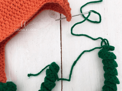 Chain 20 and make 2 dc in the 3rd chain from the hook. Make 3 dc in each remaining chain. Fasten off leaving a long tail to sew onto hat.
