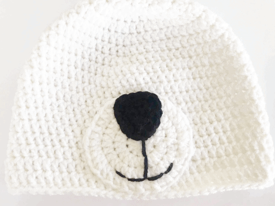 Sew the eyes onto the hat at each side of the snout. Use more black yarn to add the “eyebrows”.