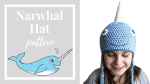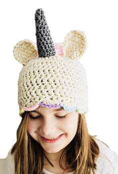 Use tapestry needle to sew each ear onto the hat around 3-4 rows down from the magic ring. Make sure the horn is centered between the two ears.