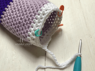Rnds 6- 32: ch 2, in each ch 1 space from the previous round you’ll make a hdc and make a ch 1 and skip over the hdc’s from the previous round. If you want your color changes to match mine, switch to light purple at the beginning of round 17 and switch to white at the beginning of round 30.