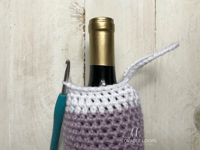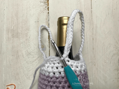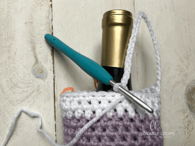Note: I was able to carry a bottle in the bag with no problem but my husband mentioned that he would need longer handles to fit his fingers- you might want to consider making a ch of 40 instead of 30 if you want the handles to be longer.