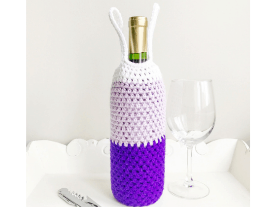 My wine bottle bag ended up being 12″ (including the handles) and the base has a circumference of 2.5 “. You can easily adapt this pattern to fit any size wine bottle.