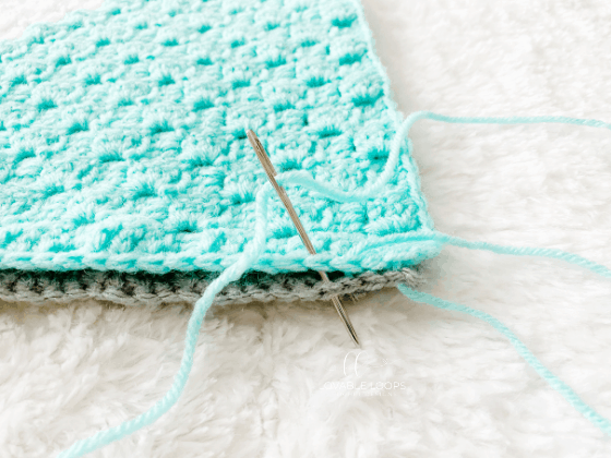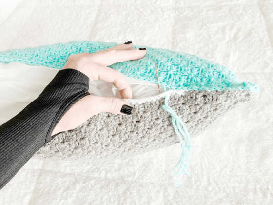 Lay your pillow covers with the WRONG sides facing each other. The RIGHT sides will both be facing outward. Using your tapestry needle and Minty yarn, sew the covers together through the single crochet borders. After you have sewn three of the four sides together, stuff with a pillow insert or Poly Fil. Sew the last side.